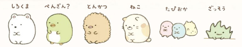 這群超萌系生物由左至右,分別是:白熊、企鵝(?)、豬排、貓、珍珠、雜草。