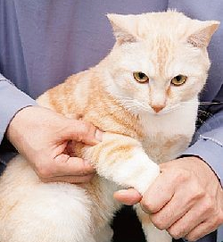 按摩腳的方式是:從前腳的大腿根部開始摸到腳掌,後腳則是從腰部順著大腿摸到腳掌;接著在前腳的膝部(可以彎曲的地方)輕壓三秒後放開,三次為一個環循,也就是一共要按九秒;按壓這裡會讓貓咪感到非常舒服哦!按完之後,握住貓咪的腳掌,從大腿到腳掌來回輕柔地按壓數次,腳部按摩就算是完成囉!