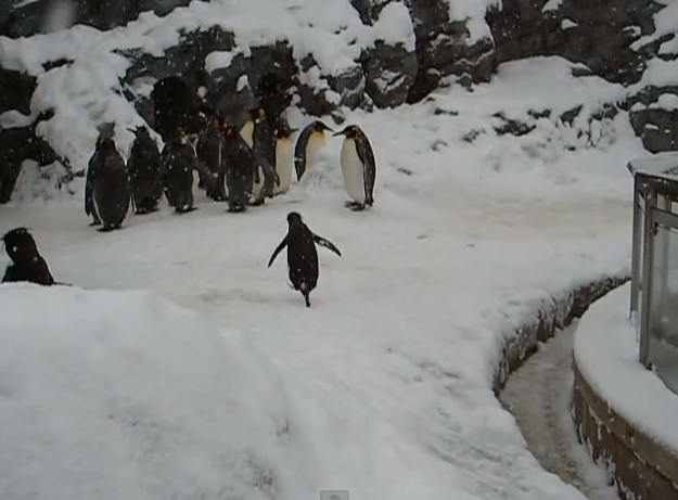 一聽到園方播放閉館音樂,畫面中左邊的一隻企鵝突然激動地跳來跳去