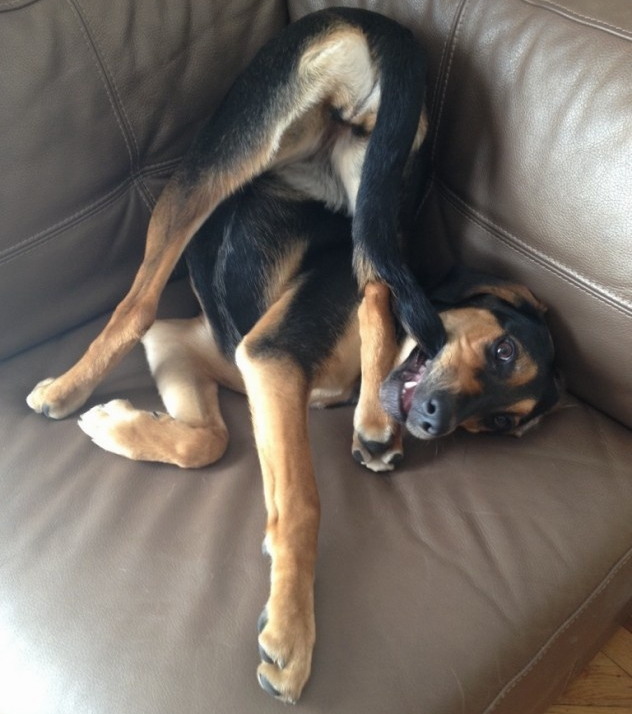 有時候,狗狗追逐自己尾巴是因為牠生病了!當狗狗肛門腺阻塞發炎時,牠們會不停地轉身舔自己的肛門,或是將肛門不停地在地上摩擦,當主人發現狗狗肛門腺阻塞發炎時,請帶牠到動物醫院醫治喔。