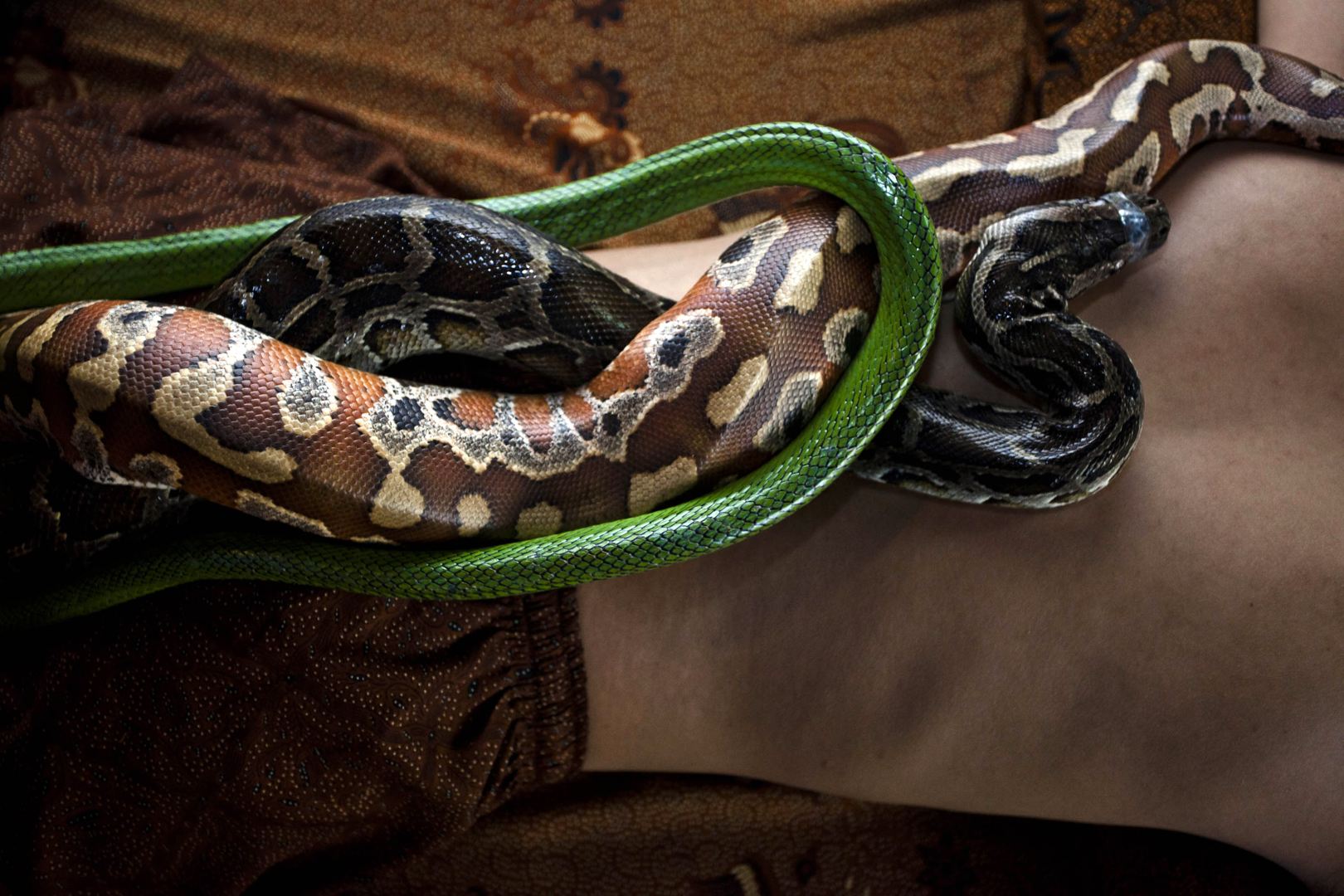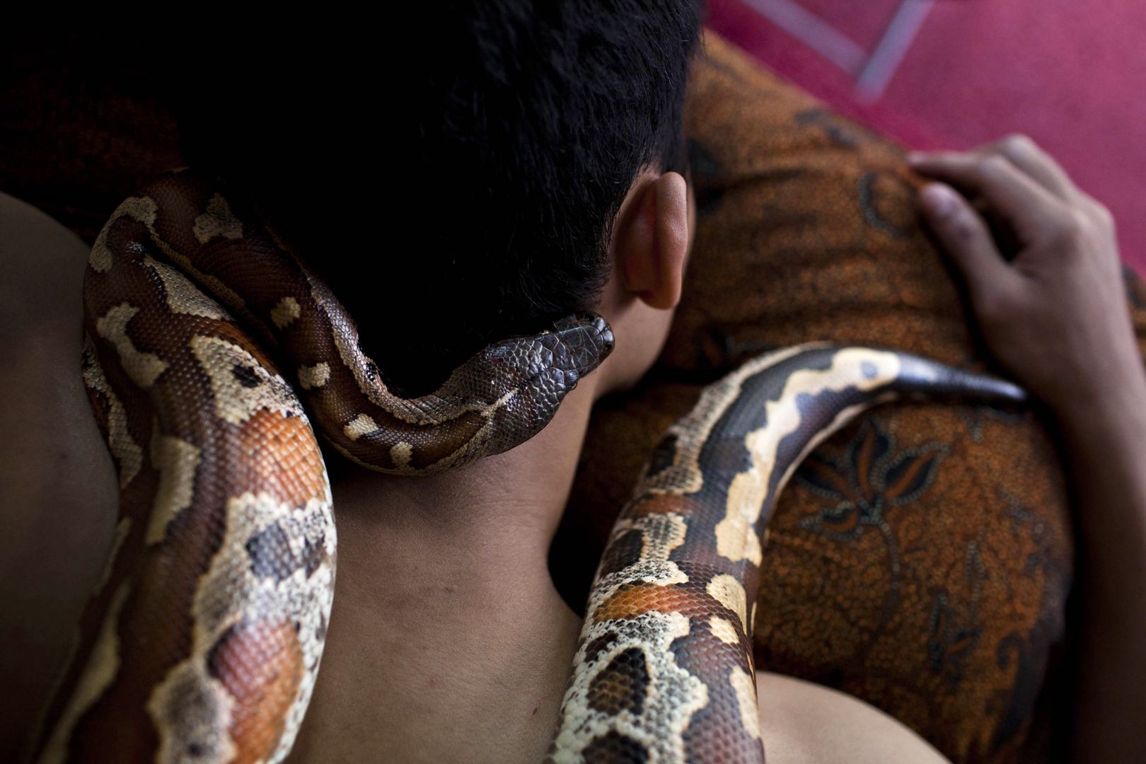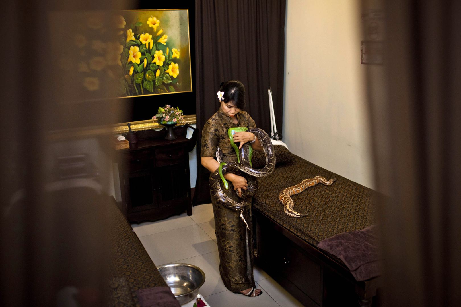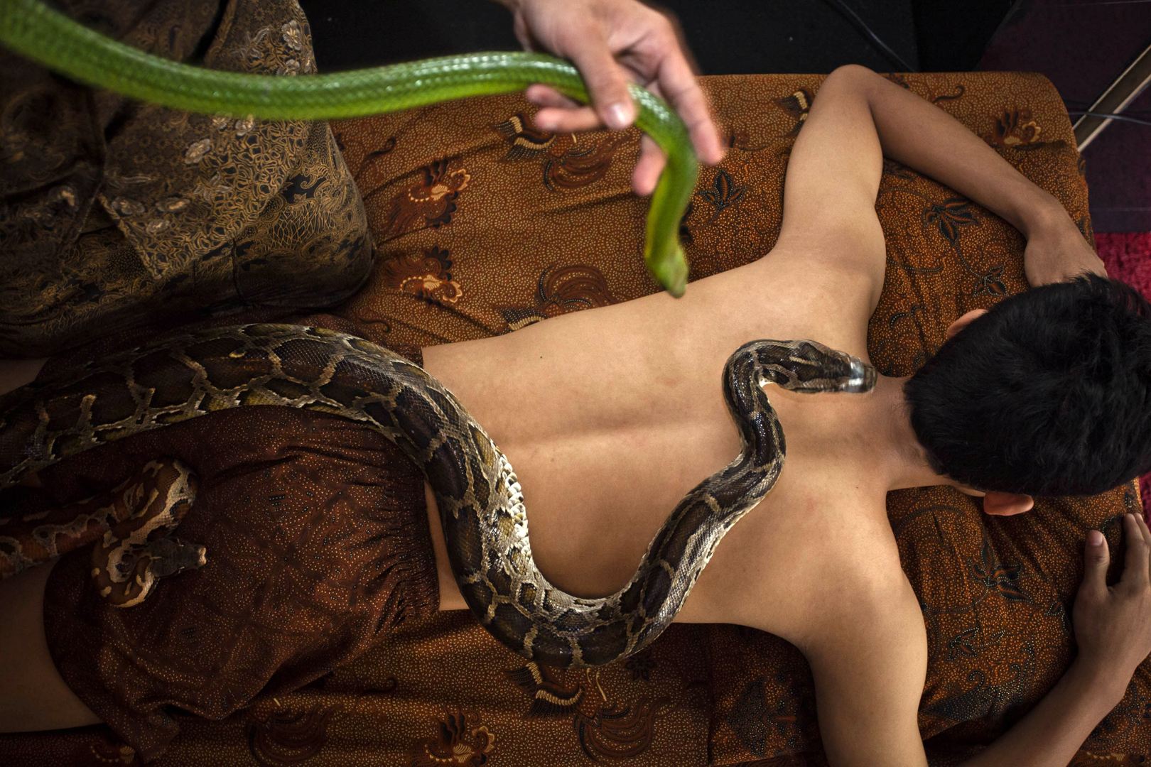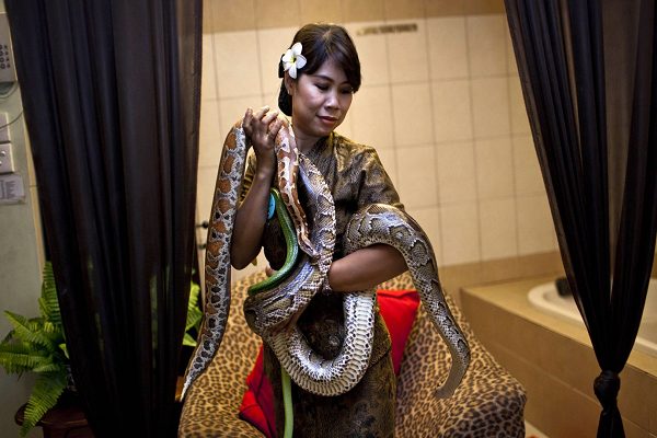 位於印尼首都雅加達的某間溫泉浴場,便推出了蟒蛇按摩師的特別服務,由一條條冷冰冰的蟒蛇代替傳統的按摩師,提供客人不同於以往的紓壓感受。