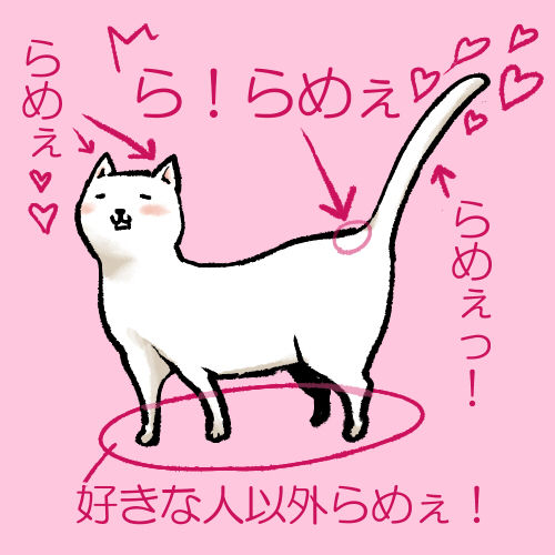 有加愛心的頭頂和尾巴根部是貓咪喜歡的地方,沒愛心的尾巴和腳是不准碰的地方