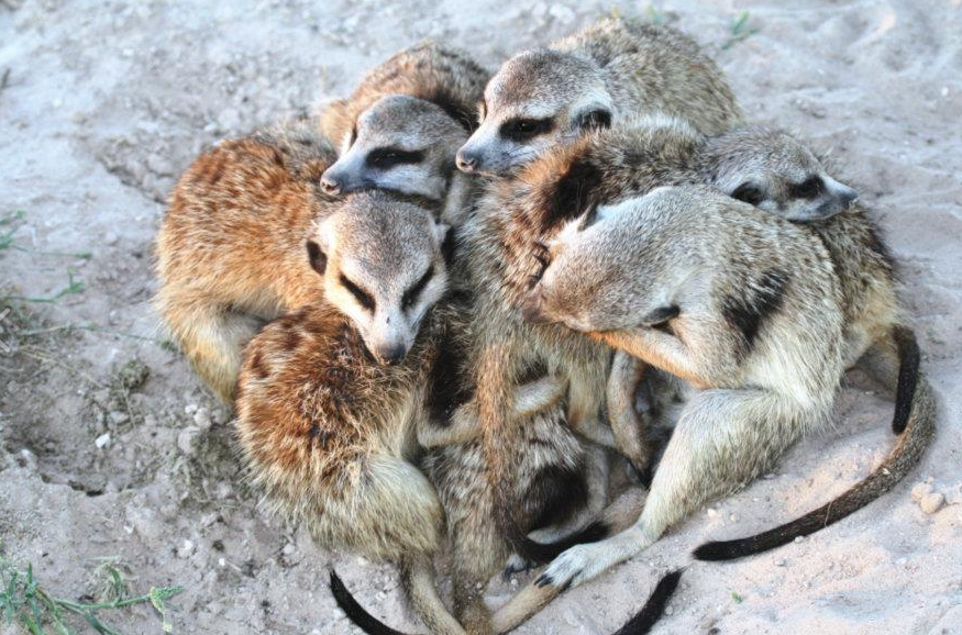 狐獴的家族很團結,對同胞也超友愛,像是在清晨起床、或是晚上睡前,都會聚在一起相互理毛,而且也很喜歡抱抱,喜愛狐獴的朋友們都會戲稱牠們是「抱抱獴」呢。