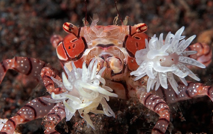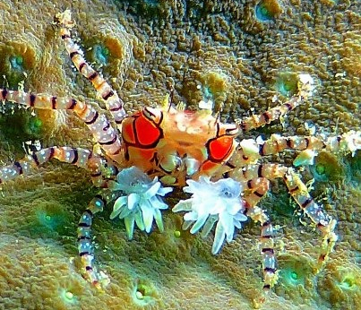 其實絨球蟹手上的兩顆彩球,就是具有強大毒性的海葵。當絨球蟹發現有敵人接近時,就會抓住毒海葵,順著海流方向左右搖擺,告誡敵人千萬不要靠近,藉此形成一層自我防衛的保護圈。