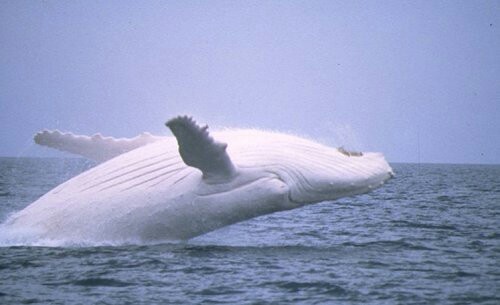 白化症的藍鯨優游在湛藍的海水,特別顯眼奪目