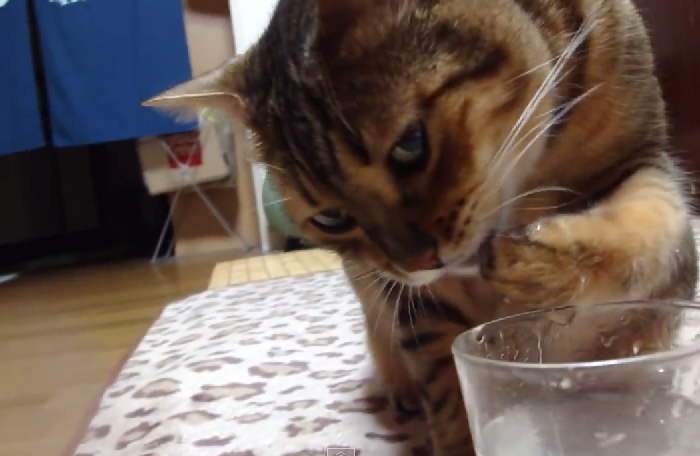 其實貓咪的這種舉動目前為止還沒有一個正確的解答,不過有一種說法被認為可能性較高:貓咪原本是生活在砂漠裡的動物,而砂漠中水資源是相當珍貴的,有時候即使是不怎麼乾淨、混濁的水,為了活命牠們還是得喝;這個時候貓咪的肉蹼就派上用場!牠們會用手去沾水,利用肉蹼把沙子和髒東西過濾掉,藉此喝到稍微乾淨一點的水。而這種習慣從貓咪的祖先流傳下來,於是貓咪們就有了這種用手沾水喝的行為。