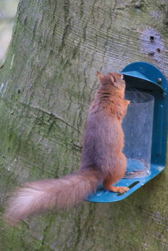 為了能夠得到餵食器底部的飼料殘渣,小松鼠決定效仿蜘蛛人攀岩走壁的絕活,把腳緊緊卡在樹幹上,眼看美食即將到手......。