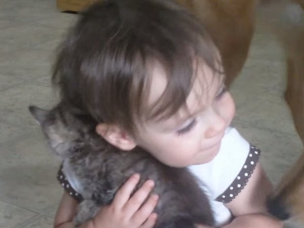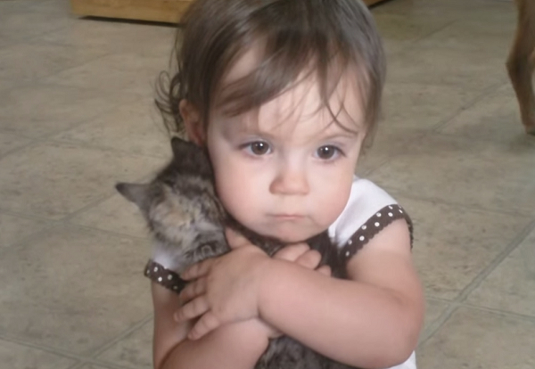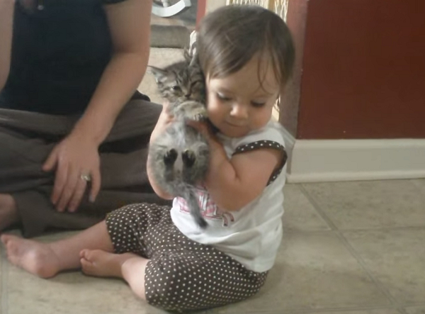 國外一位叫做奧莉維亞的小蘿莉從小就在許多動物的陪伴之下長大,某天她的爸媽戴文和艾莉卡又在野外撿到一隻瘦弱的小貓咪,他們將貓咪帶回家收編,而奧莉維亞也很喜歡這隻小小新朋友,不斷地擁抱牠,捨不得放手,那個萌樣讓人都融化啦~~~