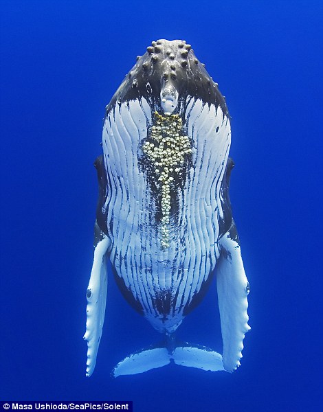 基本上,座頭鯨不太願意與人類有身體上的親密接觸,但這頭雌性座頭鯨卻突然將身體垂直,像個人類站立一般,還伸出右鰭足,似乎想與Masa Ushioda握手示好呢,真是幸運