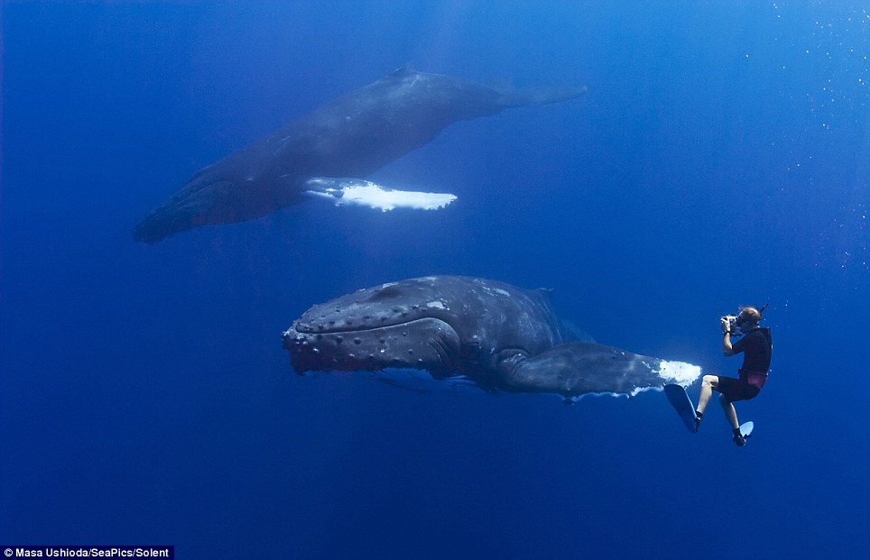 這頭雌性座頭鯨座頭鯨為了和Masa Ushioda愉快玩耍,不但對自己身旁的雄性座頭鯨們置之不理,還不時拍打海水警告試圖靠近的雄性座頭鯨,因而激起陣陣水花,十分壯觀