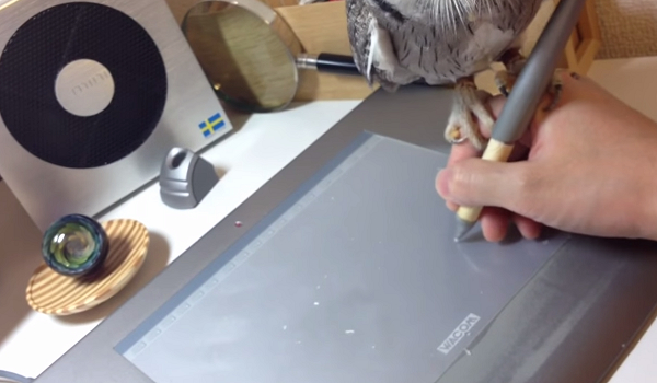 主人在用繪圖板工作,薩摩也來湊熱鬧