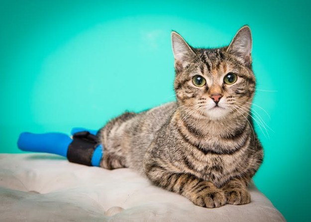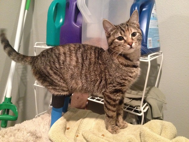美國一隻叫做靴子(Boots)的小貓咪,在很小的時候就失去了二隻後腳,幸好被動保志工發現帶回收容所照顧才能平安長大;在牠六個月大時,一位丹佛的獸醫幫牠量身訂做了二隻藍色義肢,讓靴子可以像一般貓咪一樣行走。牠現在被志工梅根(Megan Brocato)帶回家照顧,她也分享了靴子用義肢走路的可愛模樣。