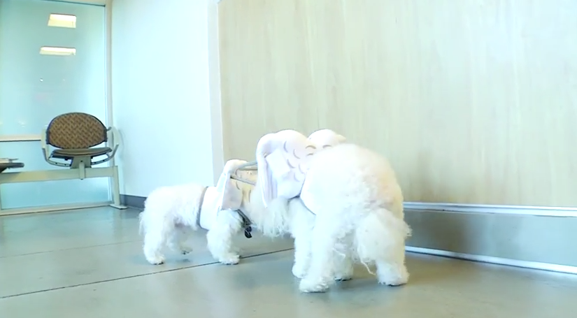 Basil被救援人員發現後,幫牠戴上這可愛的「盲犬保護翼」(又稱為鬆餅光環,Muffin's Halo)
