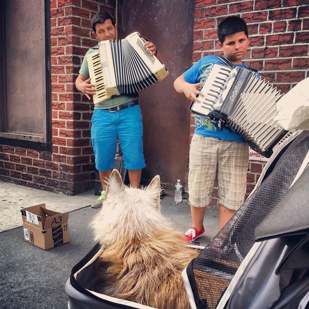 不方便行走的Elmo,在推車上靜靜欣賞街頭藝人的表演