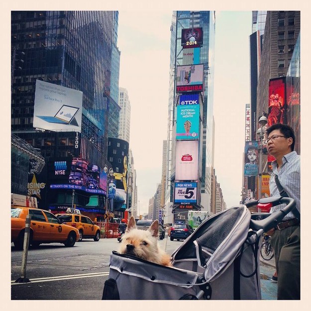James替愛犬準備了一輛小推車,帶著Elmo回到時代廣場