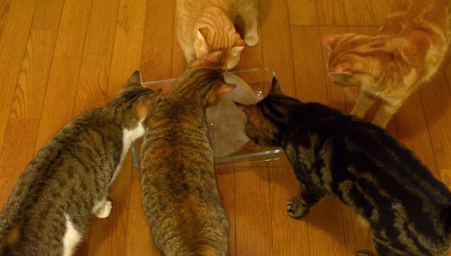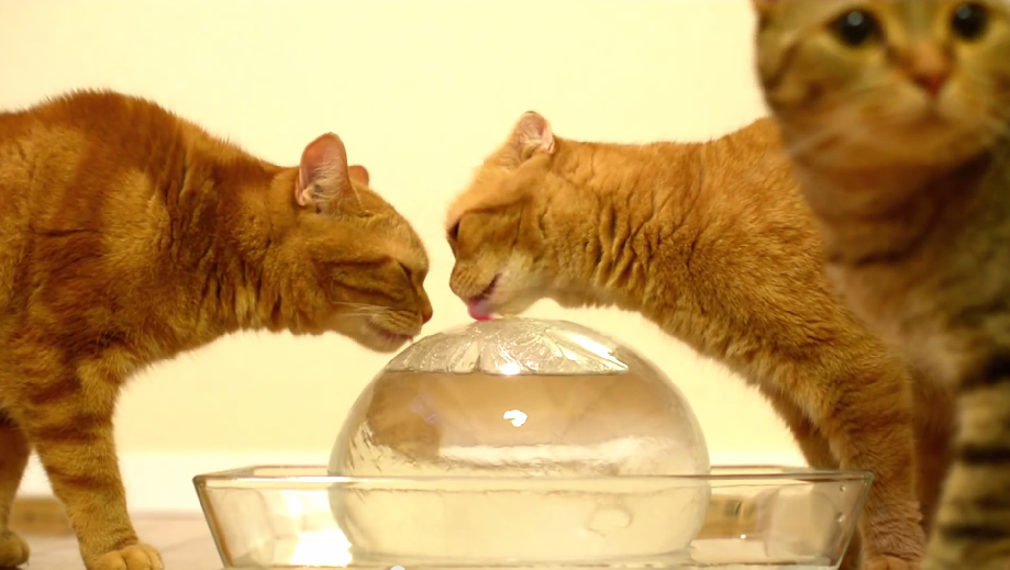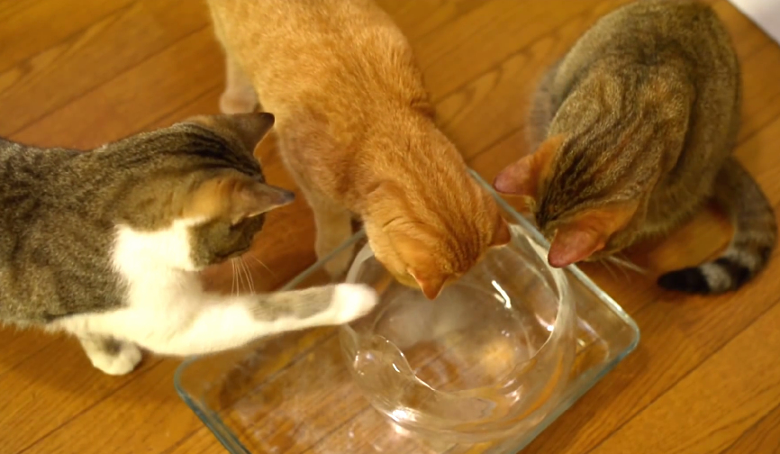 因為冰塊融化表面有水跑出來,貓咪們也開始舔舔~