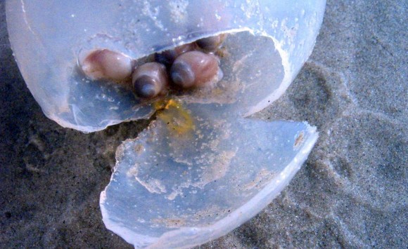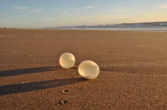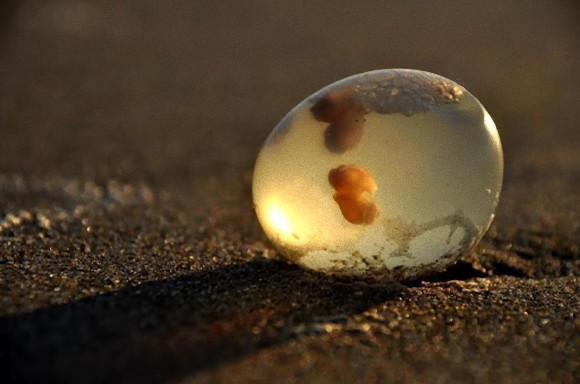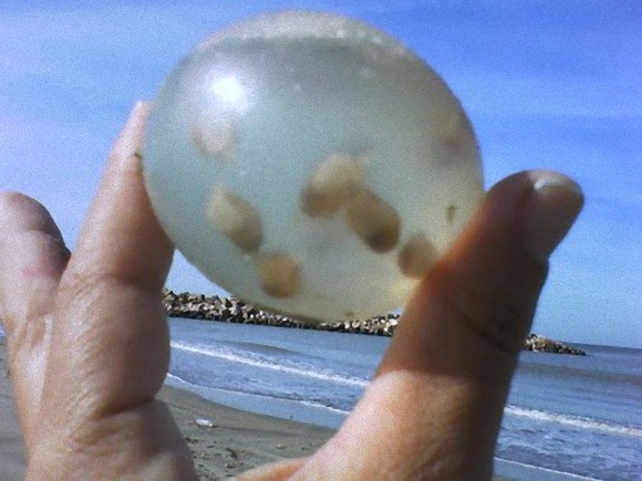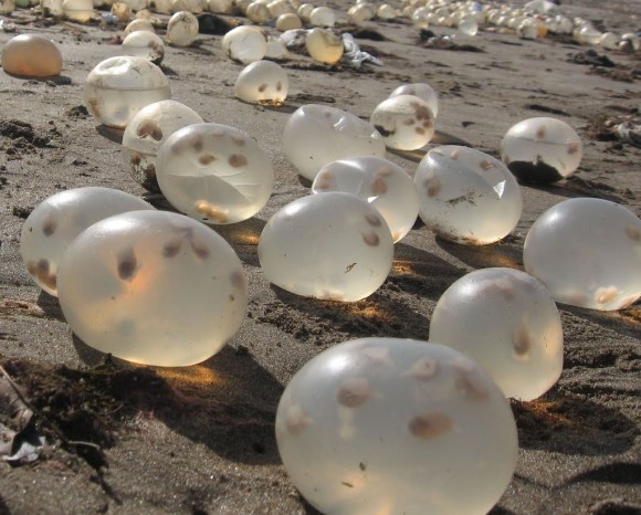 去年在阿根廷的某處海灘,出現了許多透明的、大約拳頭大小的卵狀物;當時發現的民眾說乍看之下還以為是什麼外星人的卵之類的,覺得驚嚇。但其實這是一種叫做巴西渦螺的貝類的卵鞘啦~~~從透明的外殼可以看到裡面有許多剛孵化的小渦螺噢!