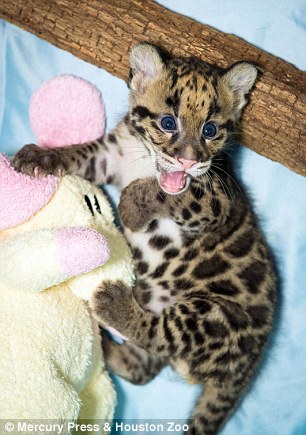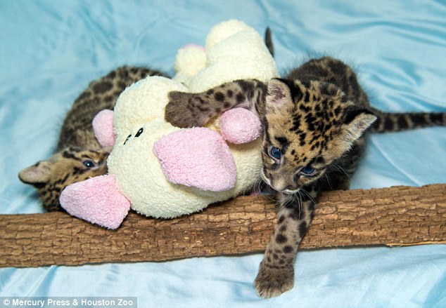 一出生就受到24小時人工照護的雲豹寶寶們,非常喜愛園方人員送的布偶娃娃