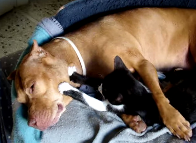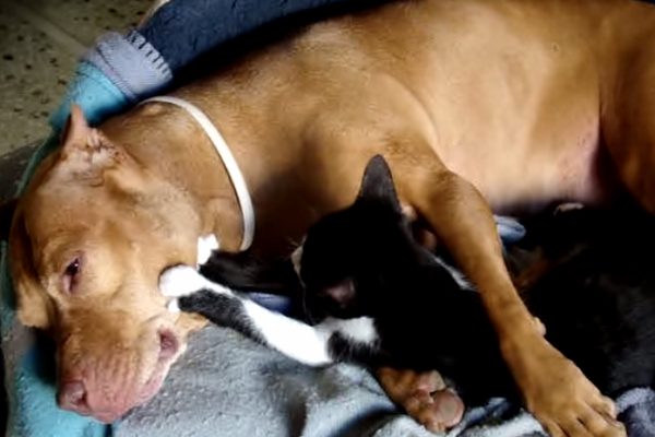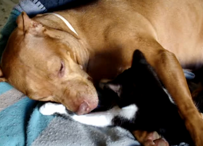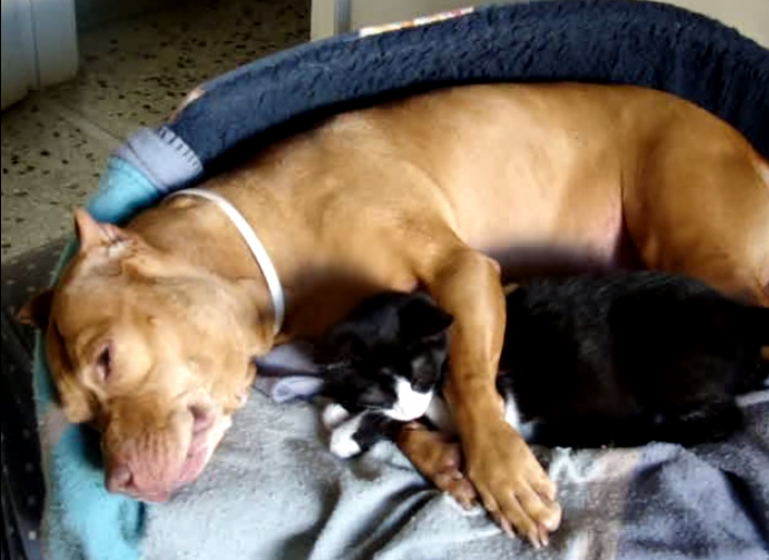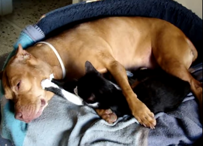 這隻鬥牛犬和小貓咪感情很好,總是抱在一起睡覺