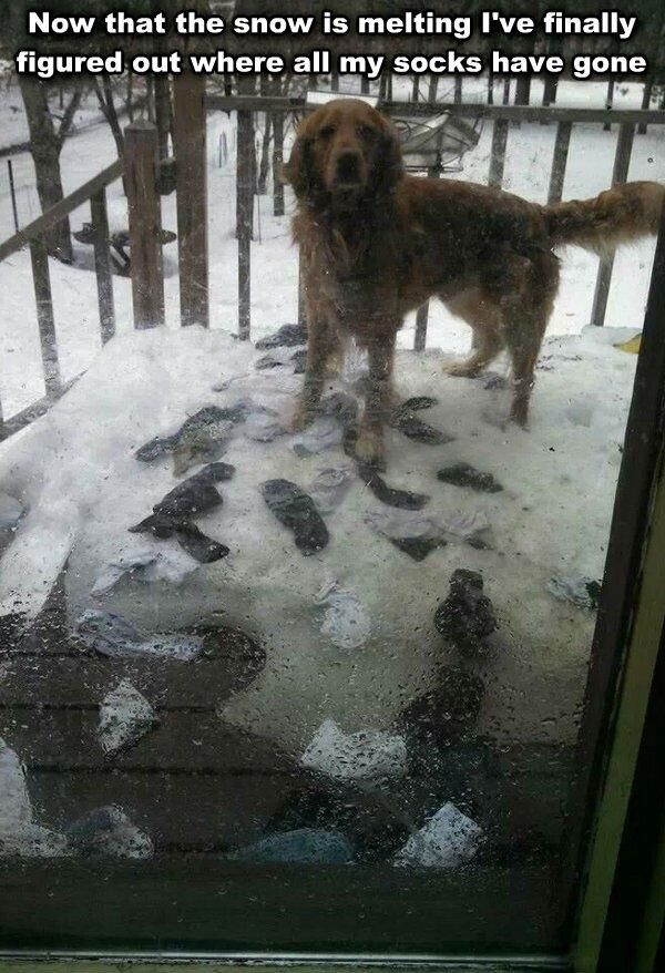 等到屋外的雪開始融化,主人終於知道那些失蹤的襪襪在哪裡了...