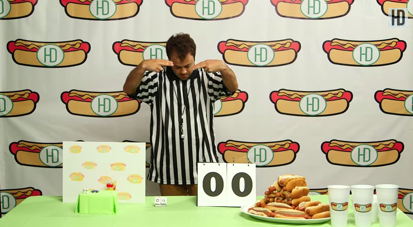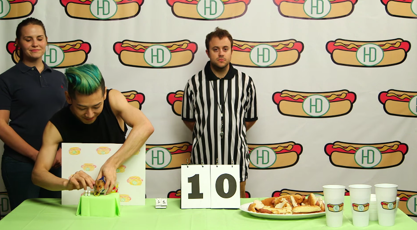 比賽一開始,小林尊立即將熱狗麵包大口大口地往嘴裡塞