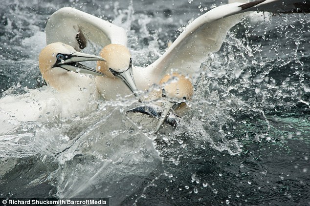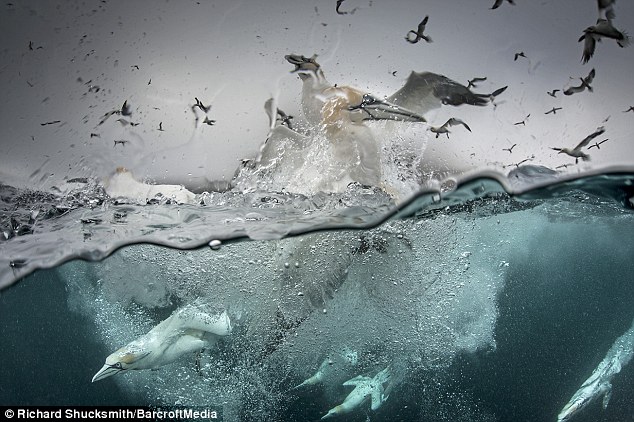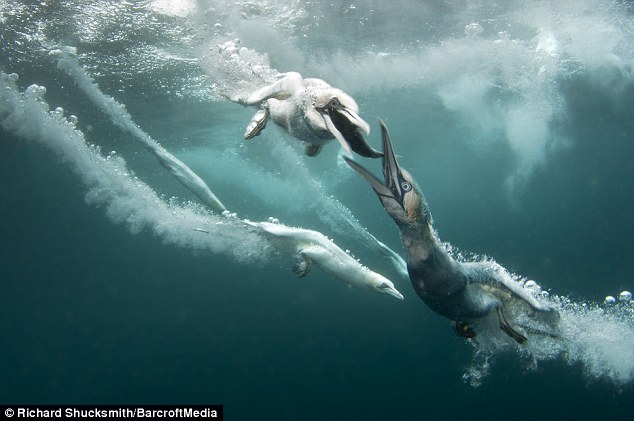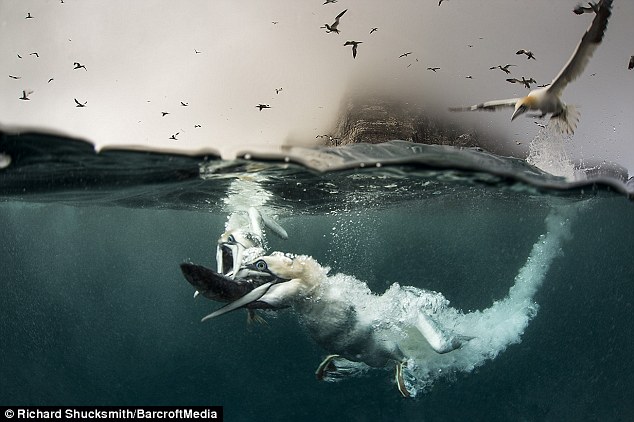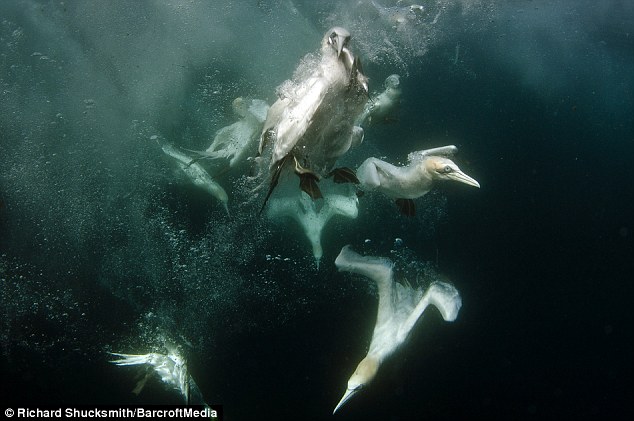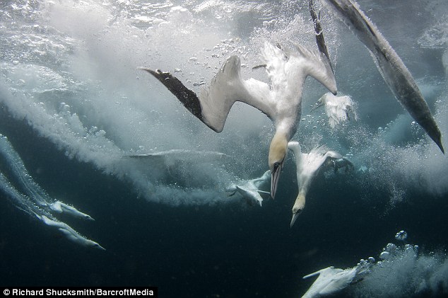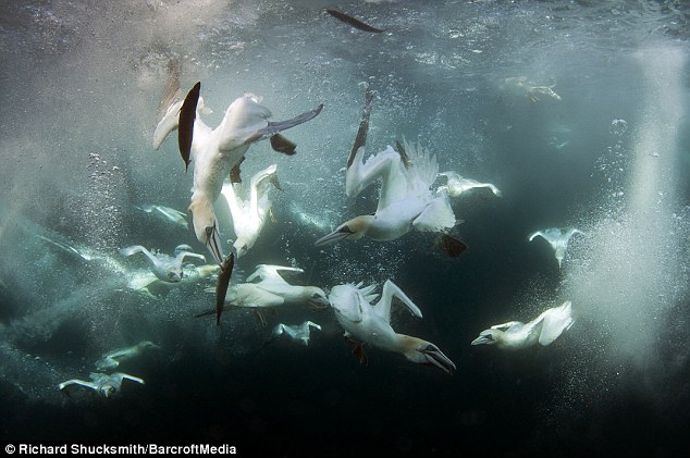 美麗的塘鵝自高處快速俯衝而下,猶如一根根快狠準的箭頭插入水中