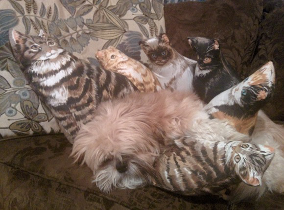 近年來隨著各種社交網站越來越普遍,使用者可以輕鬆地分享自己的近況或照片,也造就了許多的網路素人明星;而貓奴們就是屬於很喜歡分享照片的族群!各式各樣的貓咪萌照、趣照、糗照充斥在各大論壇和動物網站,總是能引來許多稱讚和共鳴。而這一切的一切看在一位愛貓卻不能養貓的網友蜜雪兒(Michelle Alexander)眼裡,真是羨慕嫉妒加眼紅啊!於是有天她突發奇想,找來一堆貓咪抱枕當模特兒,拍攝一系列她平常在網路上看到的貓咪照片,一圓她的夢想!