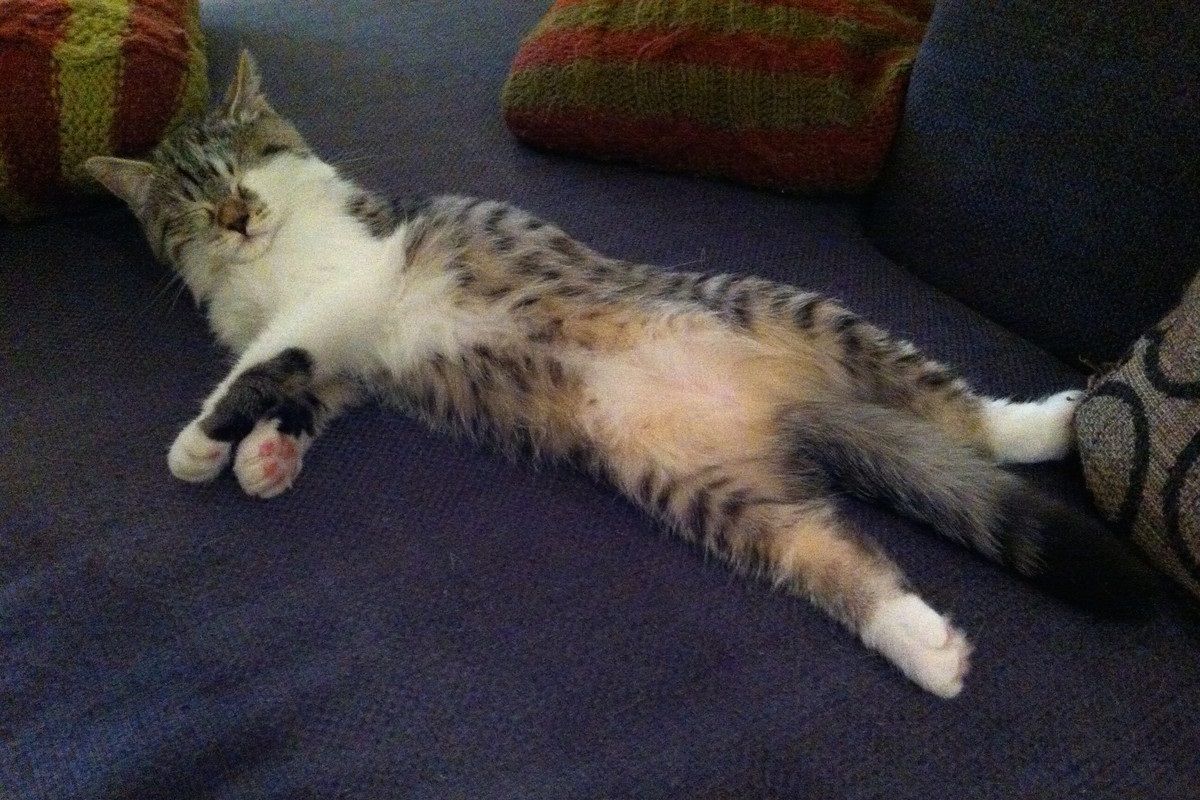 貓奴nakedacid說,一開始他以為小貓都這樣愛亂睡,也不以為意;但是查妮長大後依舊睡得很與眾不同,他才體認到他養了一隻睡相很獨特的貓咪!