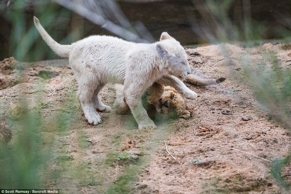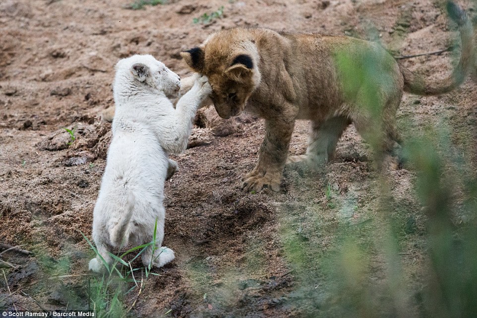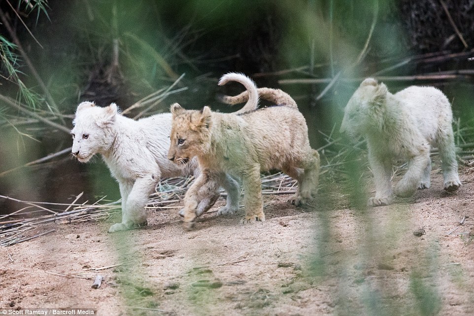 在這群小獅仔當中,只有一隻小獅是正常的棕色毛髮,其他三隻都是因為基因變異的白色毛髮