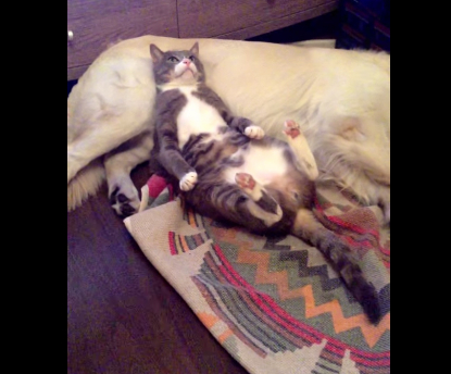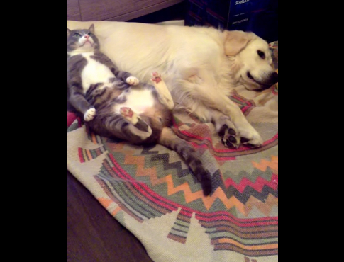 根本就是卡通情節!國外一隻調皮的貓咪把狗狗當枕頭睡到翻肚,等狗狗發現之後馬上露出「你不要生氣嘛~」的驚恐表情,然後跑給狗狗追!彷彿是湯姆貓與傑利鼠的劇情,只是主角換成了貓和狗....