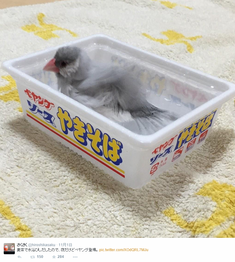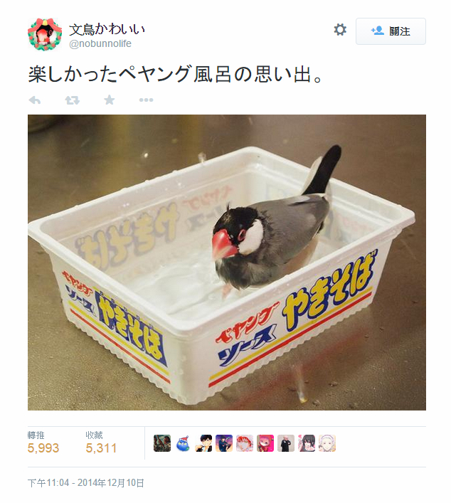 這隻叫做黑兵衛的文鳥,平常最愛在炒麵盒子裡泡澡了!因為這款盒子的大小剛好,黑兵衛玩起水來也特別起勁!
