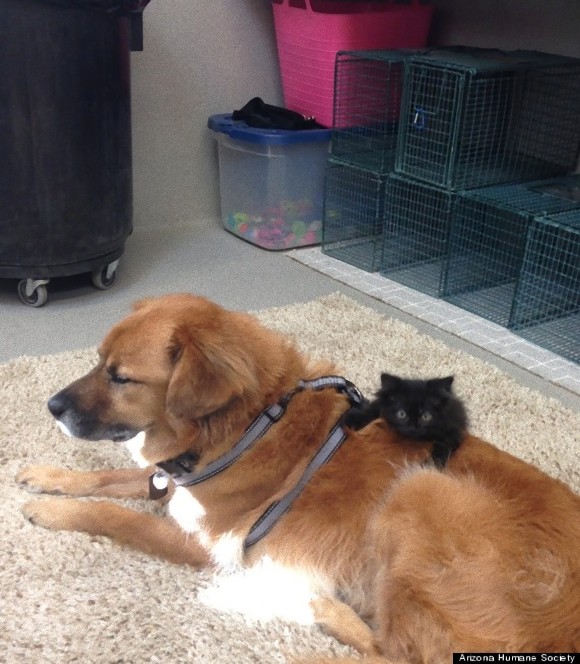 這隻叫做靴子的狗狗,是當年在卡崔娜風災時被收容所救回來的;今年已經十二歲的牠乖巧聽話,個性又穩重,因此在收容所的貓屋裡擔任照顧小貓的「工作人員」;牠的主要任務就是將一些個性緊張、有攻擊性的小貓們調教成社會化又親人的貓咪,讓牠們的認養率能夠提高!可說是貓咪們的守護者!