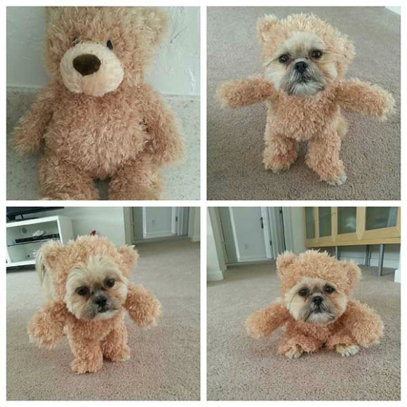 泰迪熊可愛的樣子一直是很多人最愛,尤其看過電影熊麻吉之後,一定也有很多人會希望自己的泰迪熊會動會走路!於是一隻西施狗的主人就突發奇想,把愛狗的頭套在挖空的泰迪熊上,看起來真的很是活生生會動的泰迪熊呢!