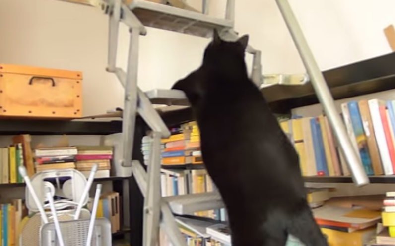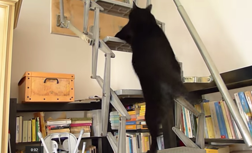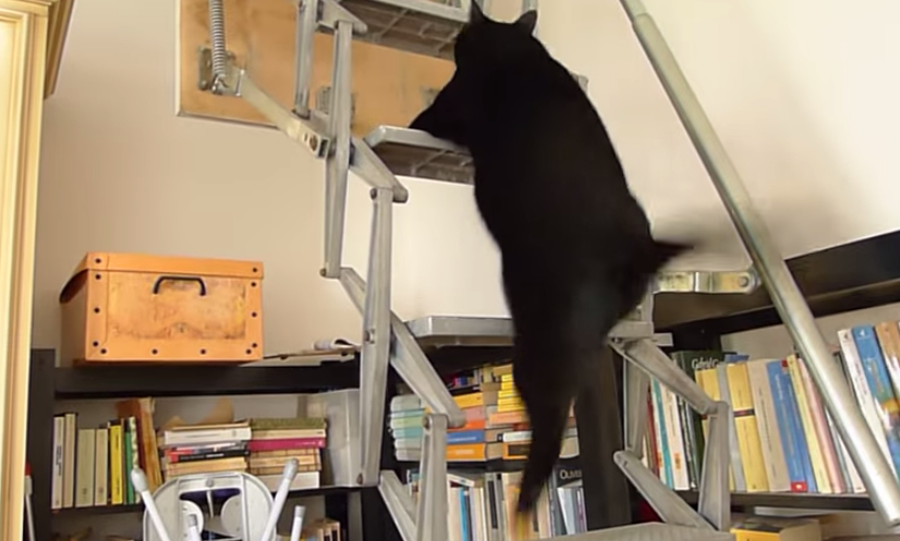 這隻大黑貓正努力地跳上通往閣樓的樓梯