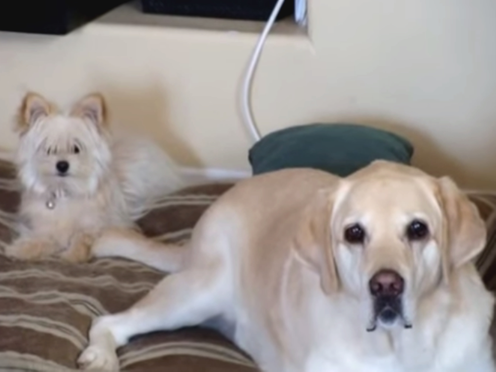 一開始,二隻狗狗都好乖巧地趴坐著
