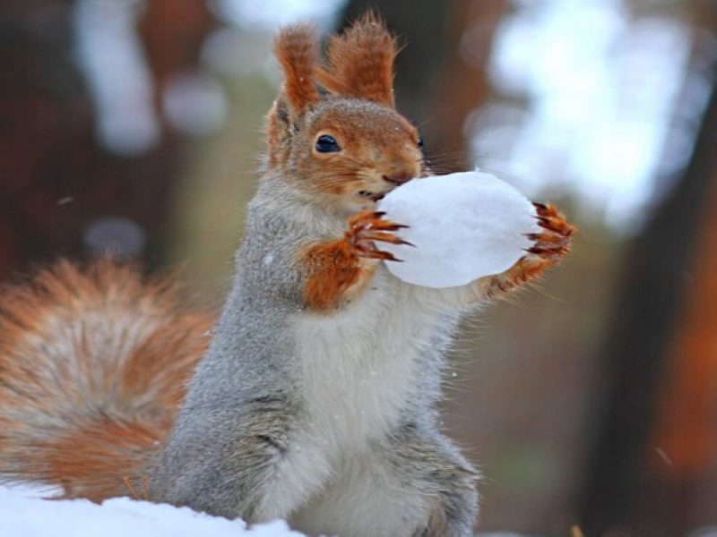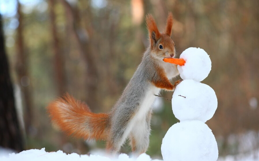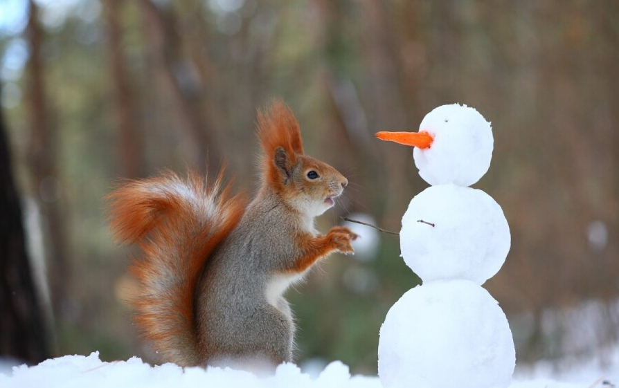 Vadim在這座森林裡花了整整三個小時觀察小松鼠,基於好奇心,Vadim隨手做了小雪球放置在松鼠旁邊,沒想到小松鼠會抱起雪球玩耍。對小松鼠的反應大感意外的Vadim,又趁勢做了迷你雪人,看見胡蘿蔔的小松鼠立刻放下手中的小雪球,跑到雪人面前,想要大大方方地啃掉胡蘿蔔呢。