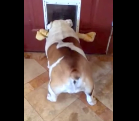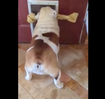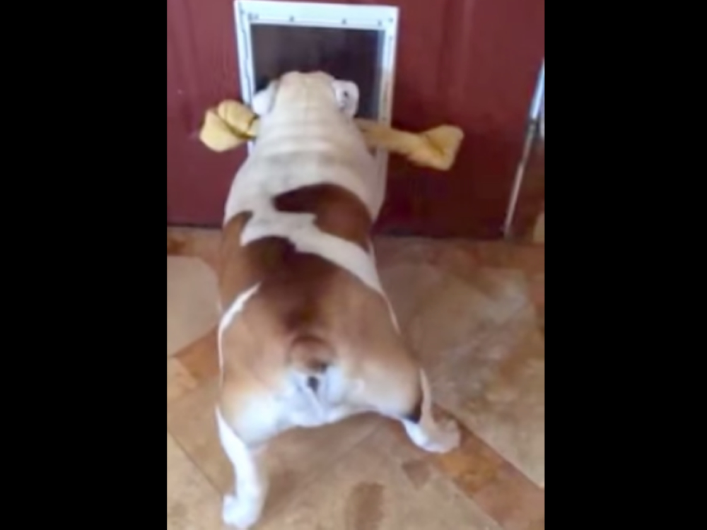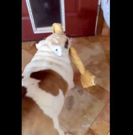 狗狗是一種憨厚的動物,因此我們常常可以看到牠們無意間的耍寶!國外有一隻叫做魯瑟(Russet)的英國鬥牛犬也是如此!去年的聖誕節,主人在廚房裡給了牠一隻超大的磨牙骨當做聖誕禮物,開心的魯瑟咬著骨頭想要帶回窩裡慢慢啃,無奈狗門實在太小,魯瑟咬著那根骨頭根本過不去!這下可怎麼辦才好呢?