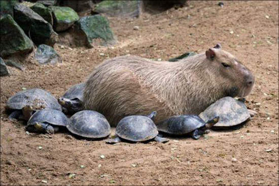 大水豚帶著小水豚,再背著鼠鼠一起出門,這畫面萌的太犯規了!