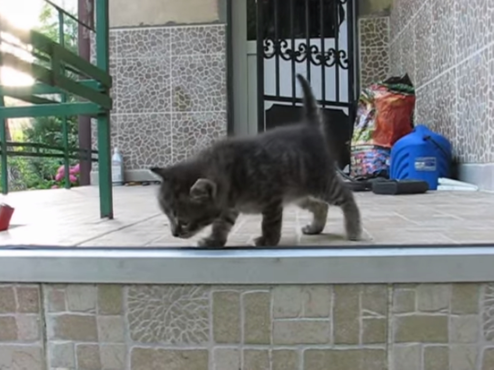 小貓咪開始學會走路之後,就會好奇地想要到處去探險!有一隻小灰貓也是如此,只不過在牠好不容易下了二階樓梯後,就被媽媽逮回去了.....