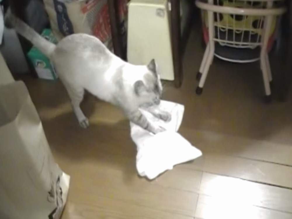 這隻勤奮的貓咪很喜歡拿抺布擦地板