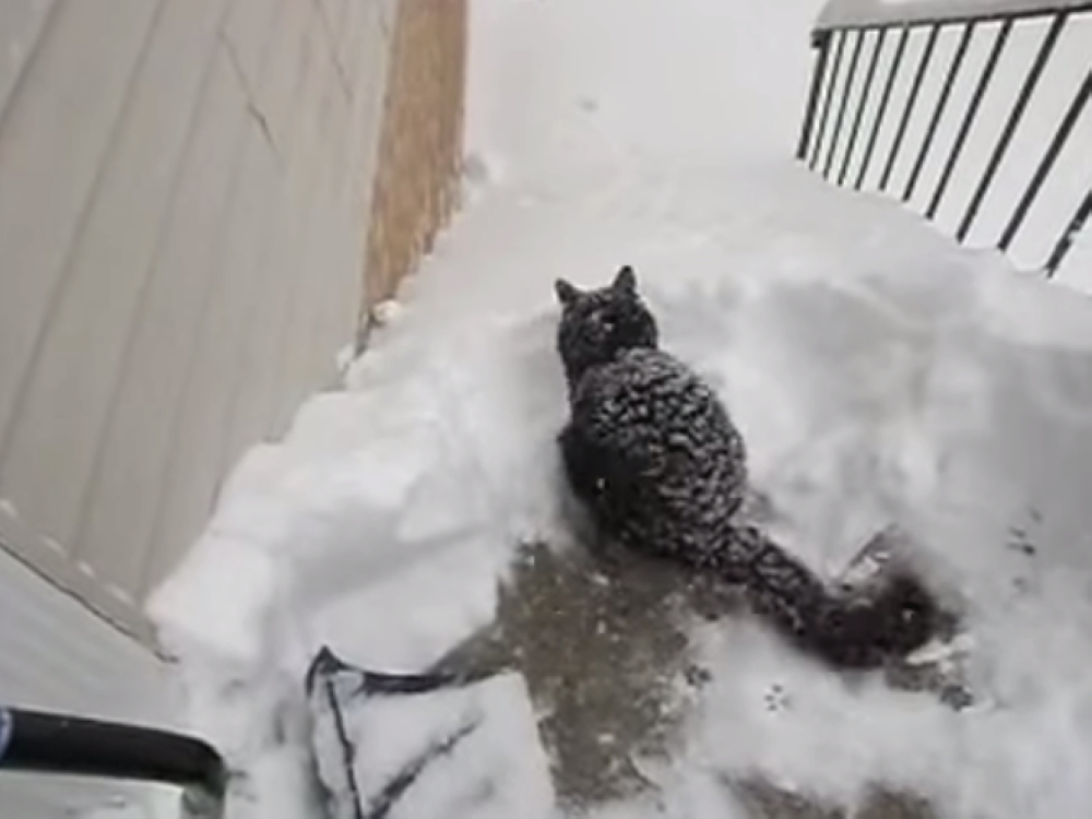 有些貓咪真的很不怕冷!在國外有一隻黑貓,即使外面下大雪,積雪厚到寸步難行,牠也堅持要出門散步!但是外面樓梯都被雪給埋住了,黑貓不知道要怎麼走;最後牠決定直接從旁邊欄桿一躍而下,結果就是....