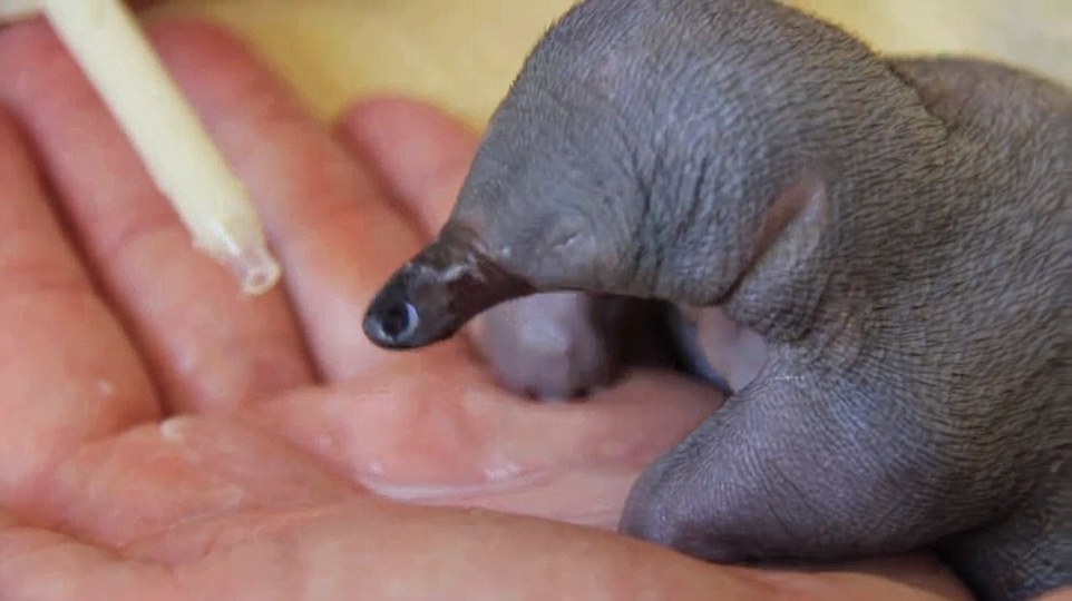 由於針鼴寶寶太過年幼,為了保全牠的健康,保育員只能用滴管將牛奶滴在手掌中餵食