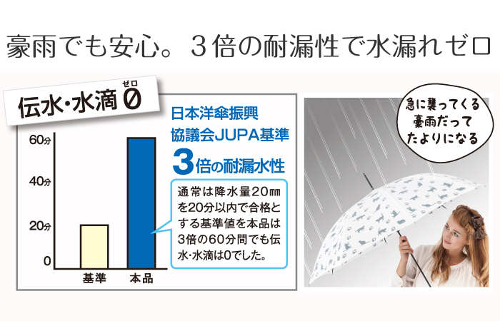 超越日本規定的防水基準三倍的超強防水力,不用擔心雨太大時會漏水~