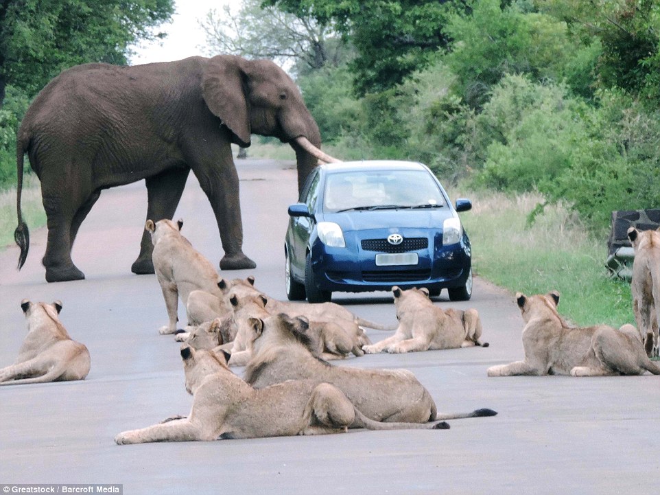 某天,一名藍色轎車在南非克魯格國家公園(Kruger National Park)裡行駛