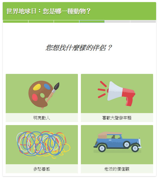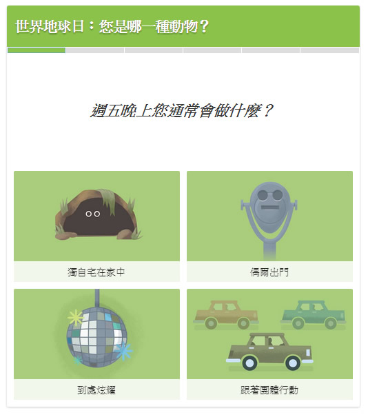 4月22日是世界地球日,google為了紀念這一天,特別將標誌換成旋轉的地球,並且根據互聯網的數據 ,選擇了最受網友歡迎的消遣小遊戲之一100%個性測驗,推出了「你是哪種動物」的小測驗,根據你的選項會判斷出不同的對應生物,蠻有趣的喔。