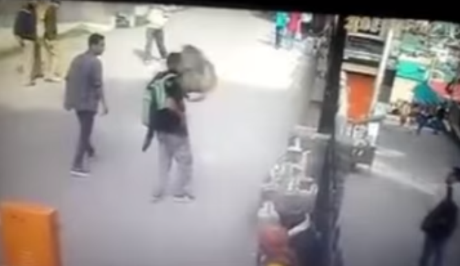 當這名背著背包的黑衣男孩在路上遇見右邊的猴子時