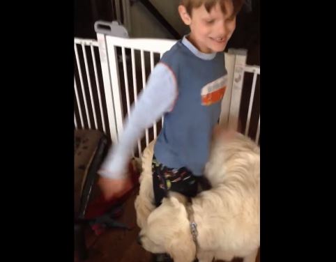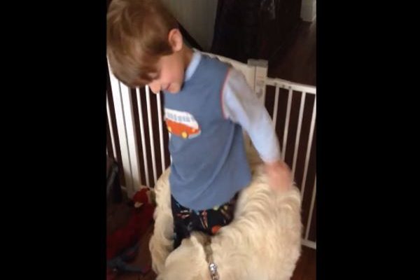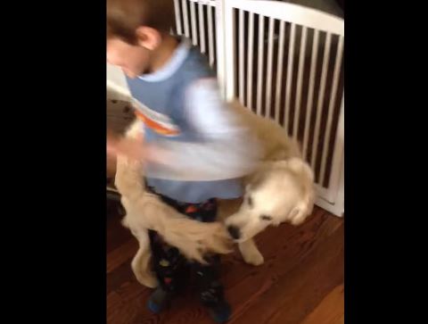 狗狗通常會用瘋狂的舔舔和撲到身上來表達牠的愛意,不過國外有一隻超另類狗狗因為太喜歡小主人了,於是用身體將他圍起來,還咬住自己的尾巴,就是不讓小主人離開!