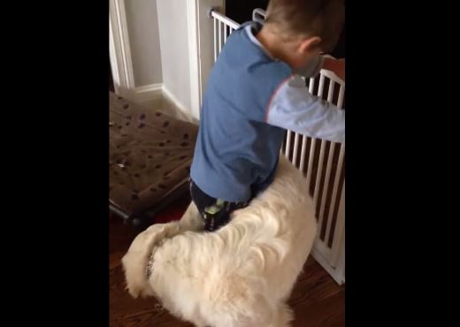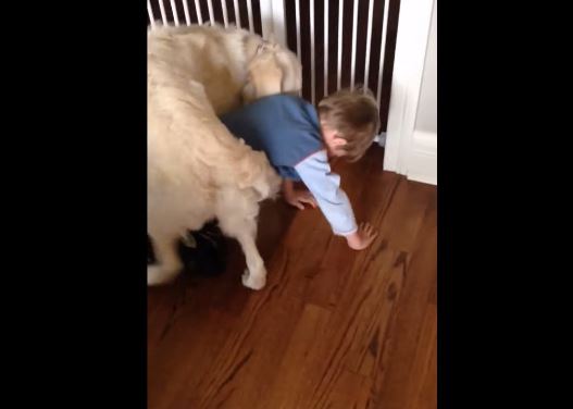 這隻可愛的狗狗和牠的小主人玩著玩著,竟然用身體把小主人圈起來