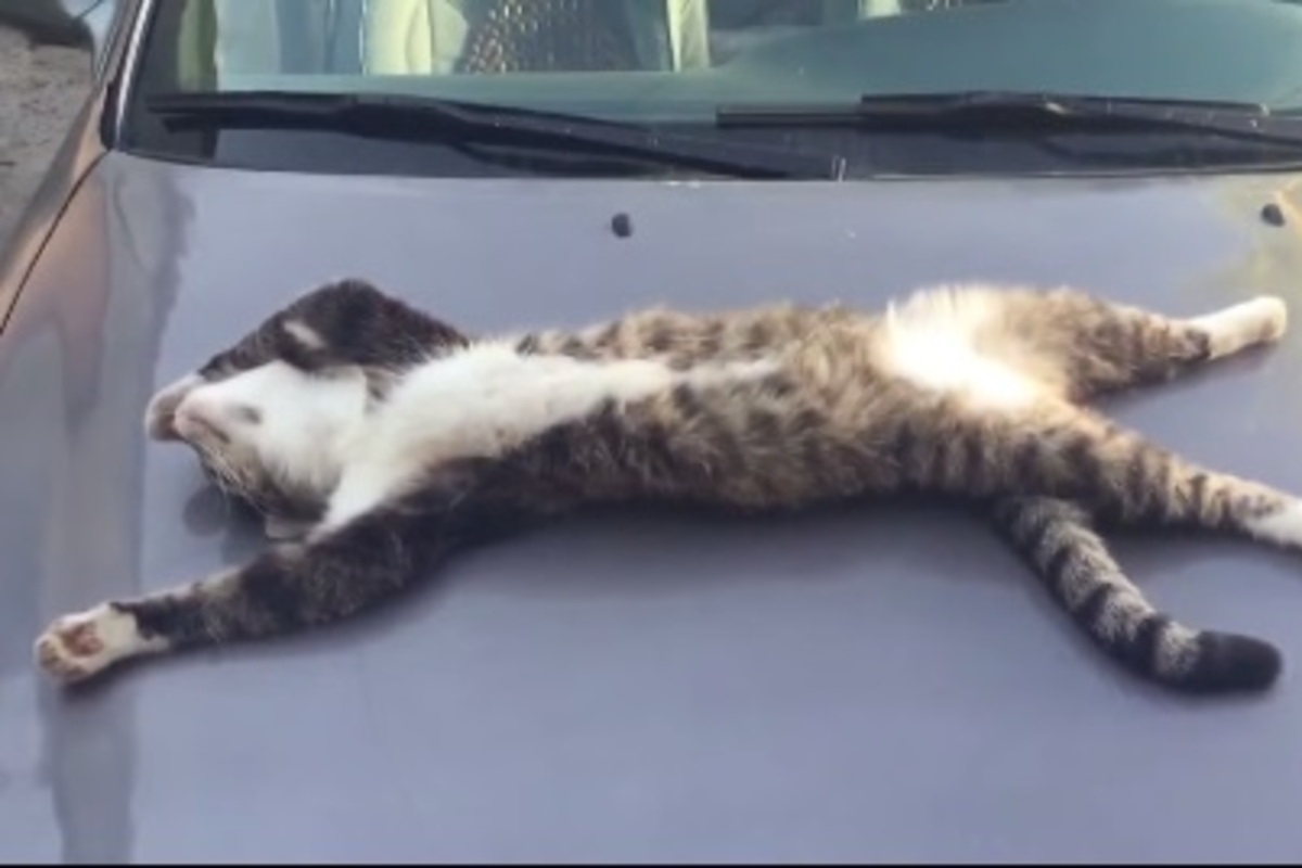 I小編之前分享過一段教你如何打開一隻睡覺貓咪的有趣影片,因為喵星人的肚皮是牠們的禁區,除非牠覺得環境很安心或太素喜,不然是不會輕易翻過來讓肚子見客,也因此大家要看到街貓翻肚可說是難如登天!對牠們來說環境中有太多危險因子,怎麼可以把最脆弱的肚子曝露在大庭廣眾之下呢?然而這個邏輯顯然不適用在本篇要介紹的這隻虎斑阿喵!牠老兄不但很大方地睡在人家車子的引擎蓋上,還非常霸氣地露出肚子睡成大字型,連拍到這段影片的人都看到笑出來啊~~~~