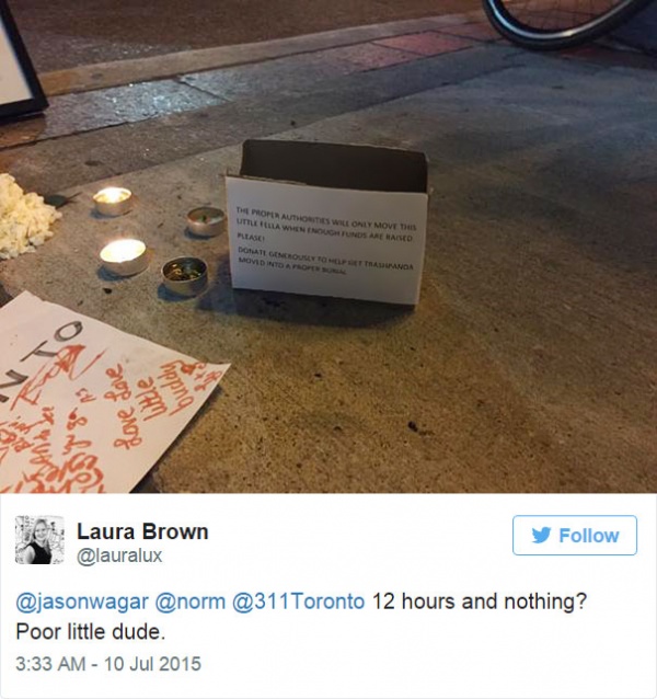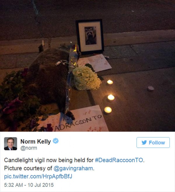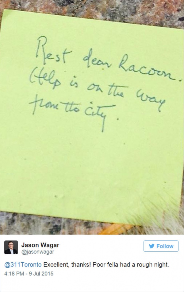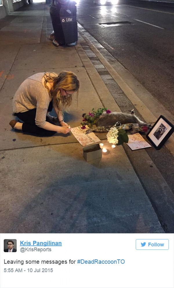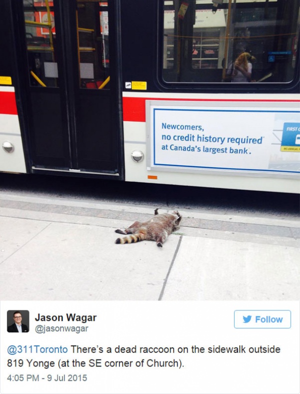 某個星期四早上9:00,一名多倫多市民在人行道上發現這隻已經成為小天使的浣熊,他趕緊拍照上傳twitter,希望政府可以派員前來處理